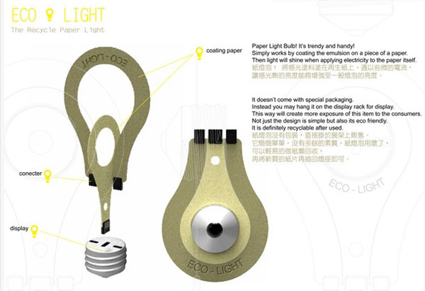 Eco-light – это проект лампочки, выполненный из бумаги. Простой и минималистичный дизайн снимает бремя упаковки и утилизации использованных ламп для улучшения состояния окружающей среды. Если эколампа становится непригодной к освещению, пользователь может спокойно заменить её, а использованную отдать в повторную переработку.