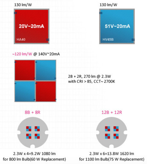 Большая часть нынешних серийных светодиодов генерирует условно белый цвет за счёт смешения лучей от синего светодиода и покрывающего его люминофора, переизлучающего часть энергии в более длинноволновой области. Epistar же создала по описанной выше методике последовательного подключения как синие, так и красные светодиоды.