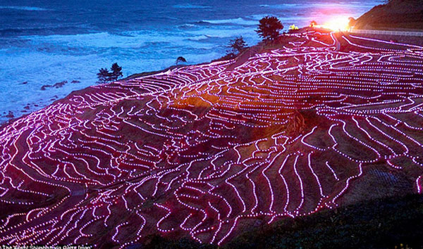 Розовые светодиоды загораются и гаснут на фоне океана, создавая умопомрачительный пейзаж. Рисовые поля расположены на полуострове Ното, который славится разнообразием флоры, относительно теплым климатом, прекрасными прибрежными пейзажами и непосредственной близостью Японского моря.