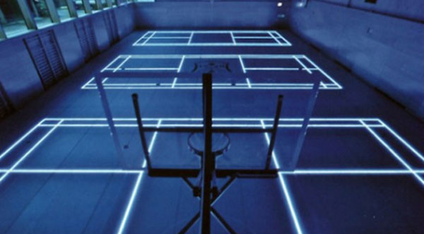Помимо размётки подобное покрытие можно использовать для отображения счёта, рекламных объявлений или иного графического материала. Или по мере необходимости можно всю поверхность пола превратить в гигантский экран. Поскольку поверхность изготовлена из закалённого защищённого стекла, то и период её эксплуатации намного выше, чем у обычного пола.