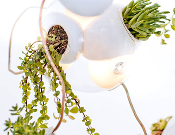 Великолепная коллекция дизайнера Omer Arbel для Bocci включает несколько подвешенных "зеленых" ламп, которые напоминают кашпо для растений, сообщает inhabitat.com. Сюрреалистические стеклянные сферы из переработанного материала выдуваются со множеством небольших отверстий, в наиболее глубокие помещаются LED-лампы или земля с растениями, преимущественно суккулентами. Электричество и подвеска обеспечивается системой медных трубок.